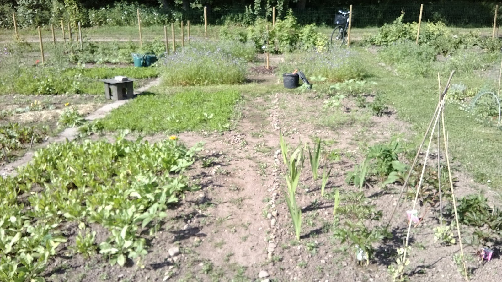 I de sidste mange solfyldte dage har jeg bare nydt at gå og luge, nyde det skønne sommervejr og lytte til bier summe - og masser af fuglesang. Der er mange vilde naturoplevelser at få, hvis man står tidligt op. I det tidlige forår huserede især fasaner og en lille flok på 3 kæmpe store zika-hjorte lige ved siden af i det lille skovbryn. Og bare for 2 dage siden hoppede en hare stille og roligt forbi mig på stien, vi var vel 1½ meter fra hindanden. Så længe dyrene ikke æder mine afgrøder - er de skønne at have tæt på! Og alt det kun 5 min på cykel fra vores lille rækkehus - det er bare i orden!